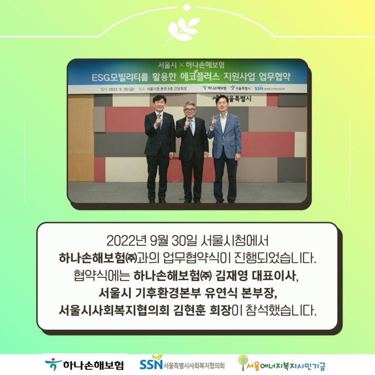 2022년 9월 30일 서울시청에서 하나손해보험㈜과의 업무협약식이 진행되었습니다. 협약식에는 하나손해보험㈜ 김재영 대표이사, 서울시 기후환경본부 유연식 본부장, 서울시사회복지협의회 김현훈 회장이 참석했습니다.본 사업은 '이동권 약자와의 동행' 및 '탄소중립 실천'을 위한 하나손해보험의 ESG경영 일환으로 추진되었습니다. 그간 차량이 없었던 기관, 혹은 차량이 노후되어 시설 운영에 어려움을 겪던 기관에 전기자동차 구입을 지원하여 온실가스 감축 및 이동권 약자의 편의를 개선하는 의의를 가지게 됩니다. 복지 서비스 제공기관에 친환경 전기차를 지원하여 복지 서비스 접근성을 높이고, 기후위기 문제를 해결하기 위해 앞장서 탄소 중립을 실천해 주신 하나손해보험㈜에 진심으로 감사합니다. |