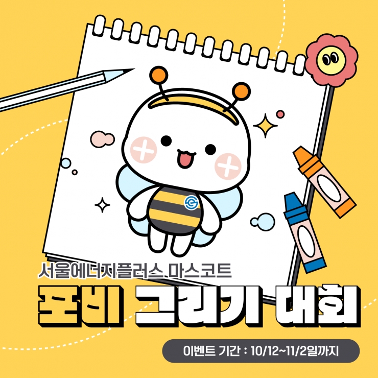 두두등장! 서울에너지플러스의 마스코트 '포비'를 소개합니다! 긍정적이고 주변을 잘 챙기는 귀여운 꿀벌 '포비' '포비'의 탄생을 맞이하여 <포비그리기대회>를 개최합니다!