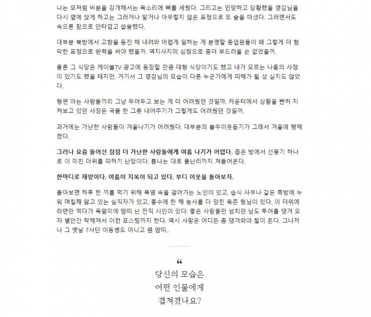 뜨거운 여름, 누구에게나 고통이지만 에너지 취약계층은 더 힘듭니다. 시인 류근이 경험했던 스토리로 오늘 연재는 진행합니다.