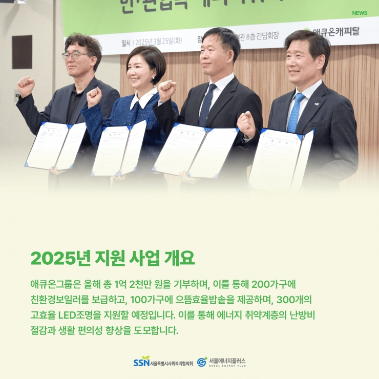 안녕하세요 ~ 민•관협력 에너지취약가구 지원사업 ‘애큐온 Green On!’이 올해도 찾아왔습니다! 2021년부터 지속적인 관심과 후원을 이어주고 계신 애큐온캐피탈과 애큐온저축은행에 다시 한번 감사드리며 |